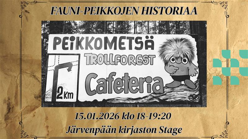 Fauni-maailman perustajan Martti Kuuskosken poika, taiteentutkija Martti-Tapio Kuuskoski kertoo Fauni-peikkojen historiasta kirjaston Stagella 15.1. klo 18-19:20. Martti Kuuskoski perusti yhdessä silloisen puolisonsa Helena Kuuskosken kanssa Atelier Faunin Tuusulassa vuonna 1955, ja yhtiön toiminta jatkui vuoteen 1972 Järvenpäässä, jonne oli vuosien kuluessa rakentunut Suomen ensimmäinen lasten elämyspuisto. Puisto toimi Järvenpäässä eri muodoissa vuoteen 1980. Fauni-peikkojen lisäksi yhtiö valmisti Järvenpäässä ensimmäiset Muumipeikko-figuurit, jotka ovat nykyään luonnollisesti keräilyharvinaisuuksia. Esitelmän lomassa nähdään harvinaisia elokuvanäytteitä sekä Järvenpään peikkopuistosta että Fauni-peikkoelokuvista 1960-luvulta.
