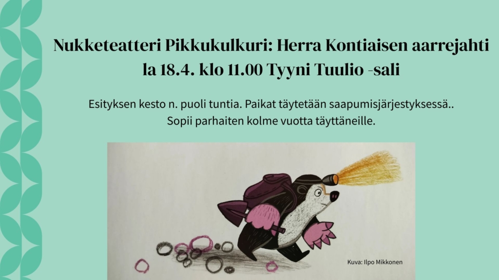 Nukketeatteri Pikkukulkurin Herra Kontiaisen aarrejahti esitetään Järvenpään kirjaston Tyyni Tuulio -salissa lauantaina 18.4. klo 11.00. Esityksen kesto on noin puoli tuntia. Ei ennakkovarauksia, paikat täytetään saapumisjärjestyksessä. Herra Kontiaisen aarrejahti sopii parhaiten kolme vuotta täyttäneille. Nukketeatteriesitys pohjautuu Katerina Gorelikin samannimiseen lasten kuvakirjaan.