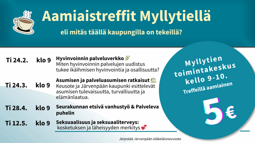 Järvenpään eläkeläisneuvosto kutsuu kaikki kiinnostuneet mukaan avoimille aamiaistreffeille myös keväällä 2026. Treffit tarjoavat matalan kynnyksen mahdollisuuden tulla kuulemaan ajankohtaisia teemoja, kysymään, keskustelemaan ja kohtaamaan kaupungin, seurakunnan ja seksuaaliterveyden asiantuntijoita.