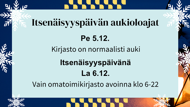 La 6.12. Kirjasto on suljettu. Omatoimikirjasto avoinna klo 6-22.