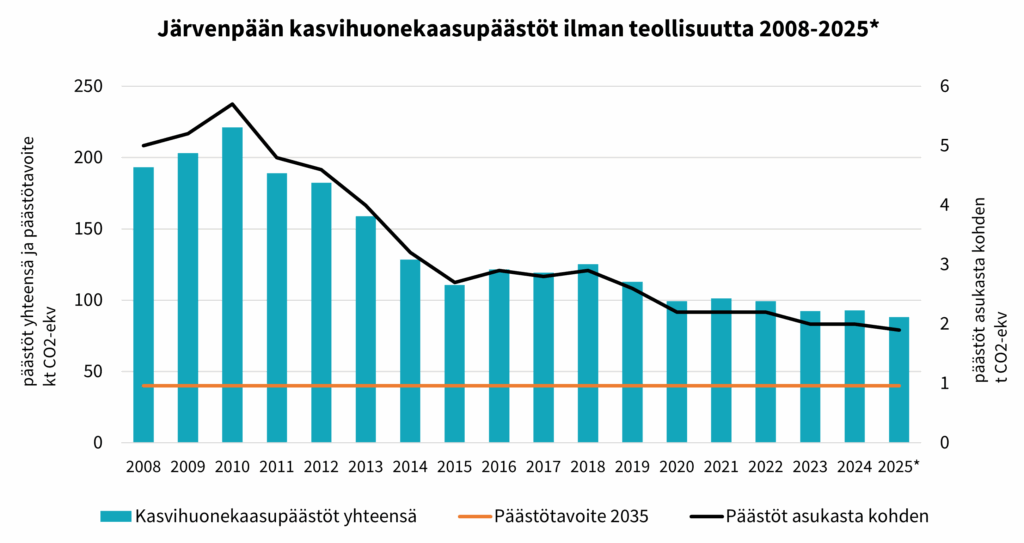 Järvenpäässä jokaista asukasta kohden päästöjä syntyi 2,0 tonnia (t) CO2-ekv. Vuoden 2025 kokonaispäästöjen on ennakoitu olevan 88,2 kilotonnia CO2-ekv ja asukaskohtaisten päästöjen 1,9 tonnia CO2-ekv/asukas. Lukuihin ei ole sisällytetty teollisuuden tuottamia päästöjä. Lisäksi Järvenpäässä tarkastellaan erikseen myös kulutuksen päästöjä KULMA-hankkeessa.