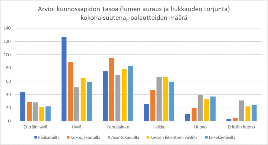 Palautteen antajista 65,6% oli sitä mieltä, että talvikunnossapidossa oli kokonaisuudessa onnistuttu vähintäänkin kohtuullisesti. Eri katutyypeillä vaihteluväli oli pääkatujen 86% ja jalkakäytävien 57,7% välillä.