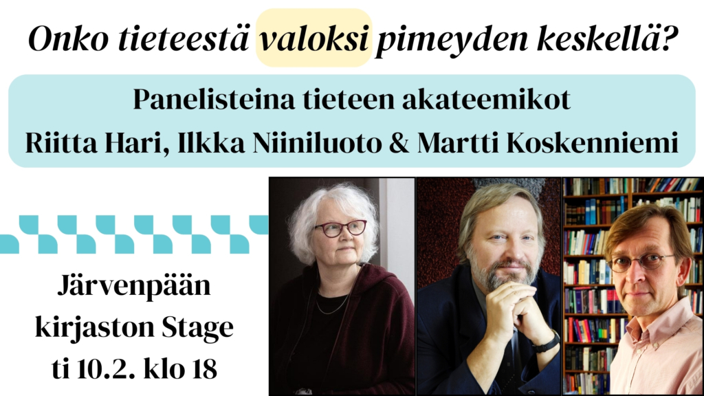 Tieteen akateemikko on Suomessa arvonimi, jonka tasavallan presidentti myöntää erityisen ansioituneille tieteen- ja taiteenharjoittajille – arvonimellä voi olla yhtäaikaisesti enintään 16 kantajaa. Järvenpään kirjastolla on kunnia isännöidä tiistaina 10.2. klo 18 paneelikeskustelua kirjaston Stagella, johon osallistuu kolme tieteen akateemikkoa tästä harvalukuisesta joukosta: aivotutkija Riitta Hari, filosofi Ilkka Niiniluoto, sekä oikeustieteilijä Martti Koskenniemi. Paneelikeskustelussa avataan akateemikkojen taustoja sekä tieteen akateemikon arvonimen merkitystä; tämän lisäksi paneelissa pohditaan tieteen nykytilaa, haasteita, ja mahdollisuuksia – toisin sanoen sitä, onko tieteen mahdollista toimia valona Suomelle ja ihmiskunnalle aikanamme, jota varjostavat moninaiset muutokset ja haasteet.