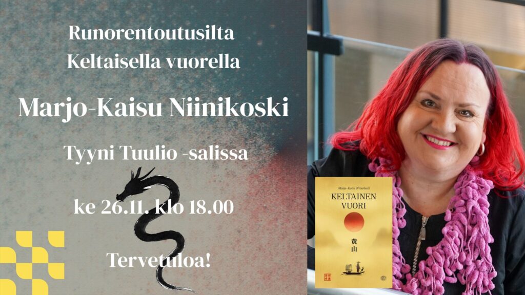 Tilaisuus on maksuton. Illan aikana voit halutessasi hankkia runoteoksen omistuskirjoituksella itsellesi tai ystävällesi.