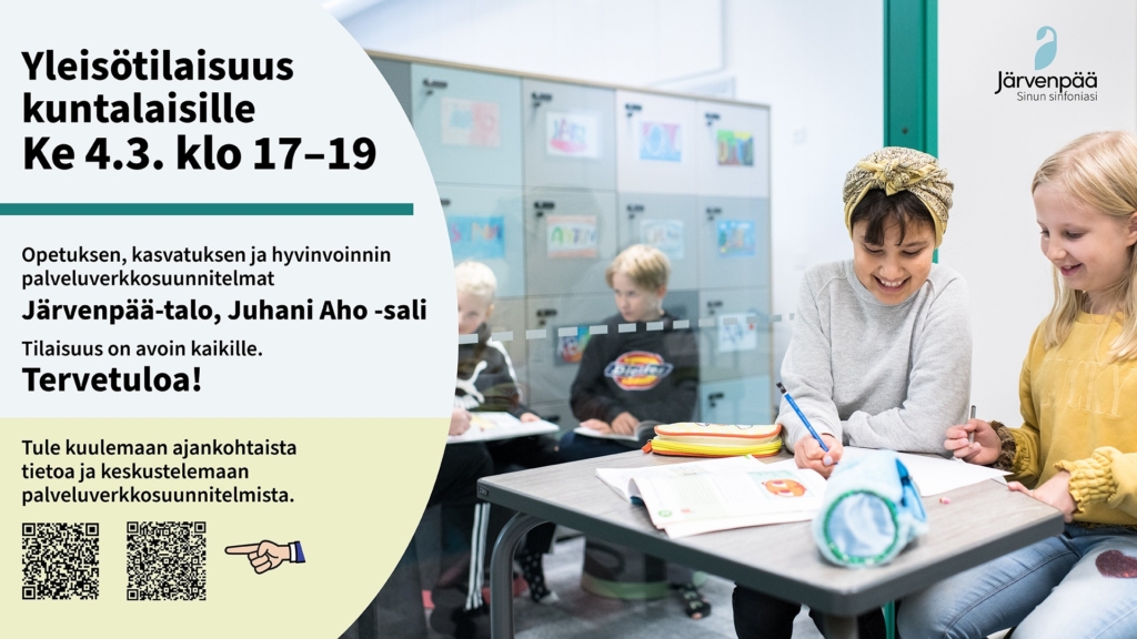 —Kaupunki ja päätöksentekoJärvenpään kaupunki päivittää opetuksen ja kasvatuksen sekä hyvinvoinnin palvelualueiden palveluverkkoja. Tule kuulemaan ajankohtaista tietoa valmistelusta ja keskustelemaan suunnitelmista!