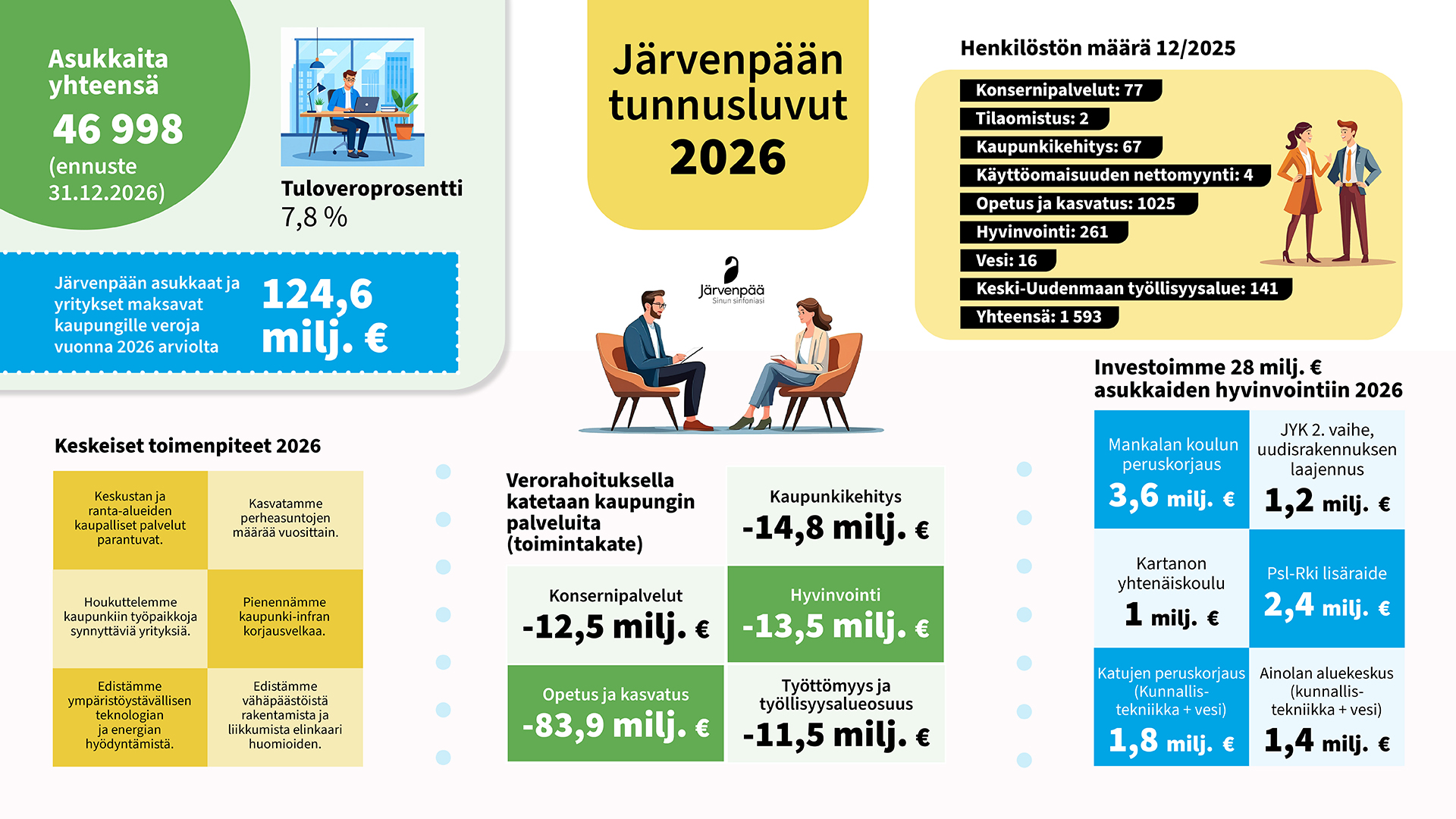 Taloustilanteesta huolimatta kasvava kaupunki rakentaa tulevaisuuttaan. Vuonna 2026 investoimme esimerkiksi katujen ja puistojen peruskorjauksiin, koulurakennusten uudistamiseen, yritysalueiden kehittämiseen, liikuntapaikkoihin sekä vesihuollon ja digitalisaation parantamiseen eli kaupungin elinvoimaan, turvallisuuteen, osaamiseen ja tulevaisuuden kasvuun.