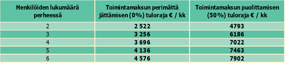 Toimintamaksu voidaan puolittaa tai jättää perimättä huoltajan hakemuksesta perheen bruttotulojen perusteella.