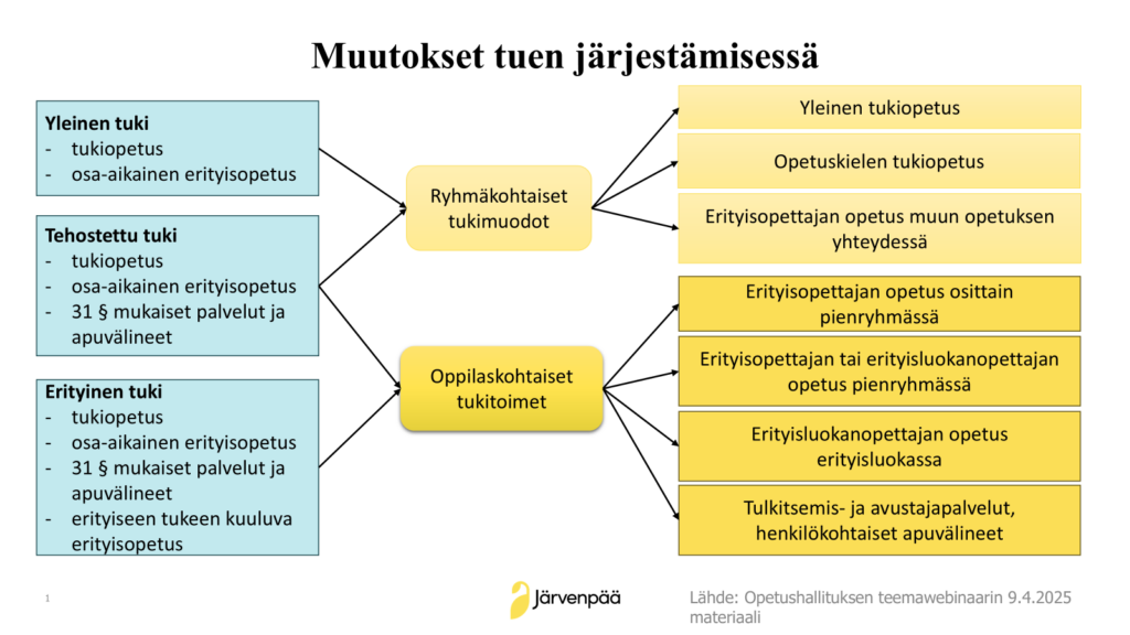 Valtakunnallisen uudistuksen vuoksi siirtymäajan jälkeen ei enää puhuta kolmiportaisesta tuesta (yleinen tuki, tehostettu tuki, erityinen tuki) ja pedagogisia asiakirjoja koskevat nimet muuttuvat (luovutaan käsitteistä pedagoginen arvio, pedagoginen selvitys, oppimissuunnitelma ja henkilökohtainen opetuksen järjestämistä koskeva suunnitelma).