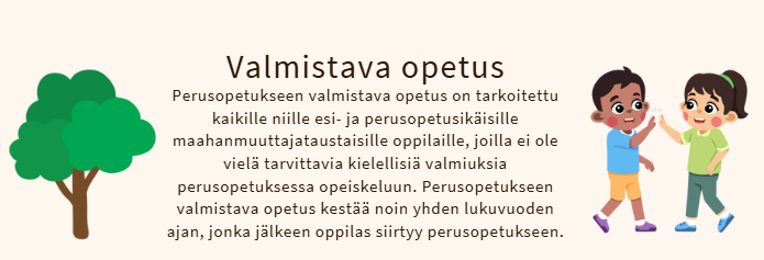 Valmistavan opetuksen tavoitteena on vahvistaa lapsen kielitaitoa sekä valmiuksia esi- ja perusopetusta varten. Opetus perustuu erilliseen perusopetukseen valmistavan opetuksen opetussuunnitelmaan.