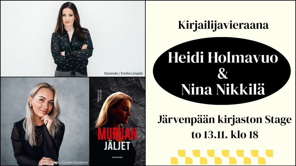 Heidi Holmavuo ja Nina Nikkilä saapuvat Järvenpään kirjaston Stagelle to 13.11. klo 18 kertomaan uudesta romaanistaan Murhan jäljet.