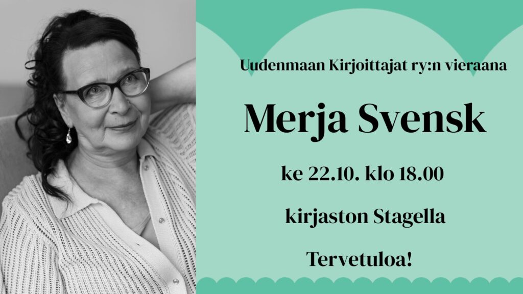 Uudenmaan Kirjoittajat ry:n lokakuun vieraana Järvenpään kirjaston Stagella on helsinkiläinen Merja Svensk ke 22.10. klo 18.00.